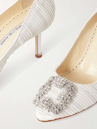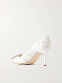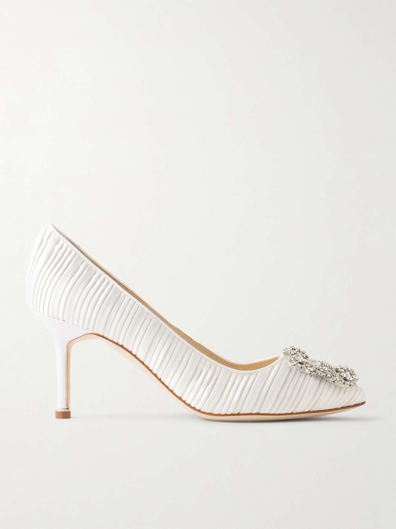EDITORS'NOTES Manolo Blahnik's pleated satin 'Hangisi' pumps have been made at one of the designer's beloved factories in Italy, where he's often found developing samples and whittling lasts by hand. Lined and soled in leather, they're topped with the brand's signature glistening crystal buckle that first appeared in Spring '08 and has remained enduringly chic ever since. This white pair is perfect for your big day. SIZE & FIT - Fits true to size, take your normal size - Italian sizing DETAILS & CARE - Heel measures approximately 70mm/ 3 inches - White satin - Slip on