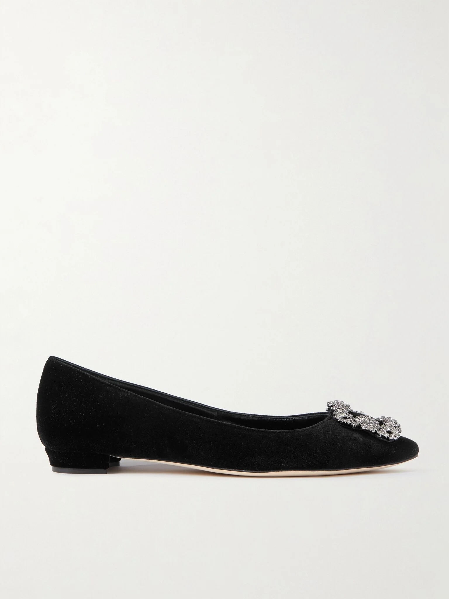 Manolo Blahnik has sketched every shoe by hand since 1970 - the drawings are as much works of art as the finished product. His beloved 'Hangisiflat' point-toe flats have been re-imagined in black velvet and embellished with the iconic crystal buckles that were originally inspired by Napoleon I, Josephine and Pauline Bonaparte. Care for them between wears and they'll remain in your collection for years to come. Size & Fit - Fits true to size, take your normal size - Those with wide feet may wish to take the next size up - Italian sizing Details & Care - Heel measures approximately 10mm/ 0.5 inches - Black velvet - Slip on