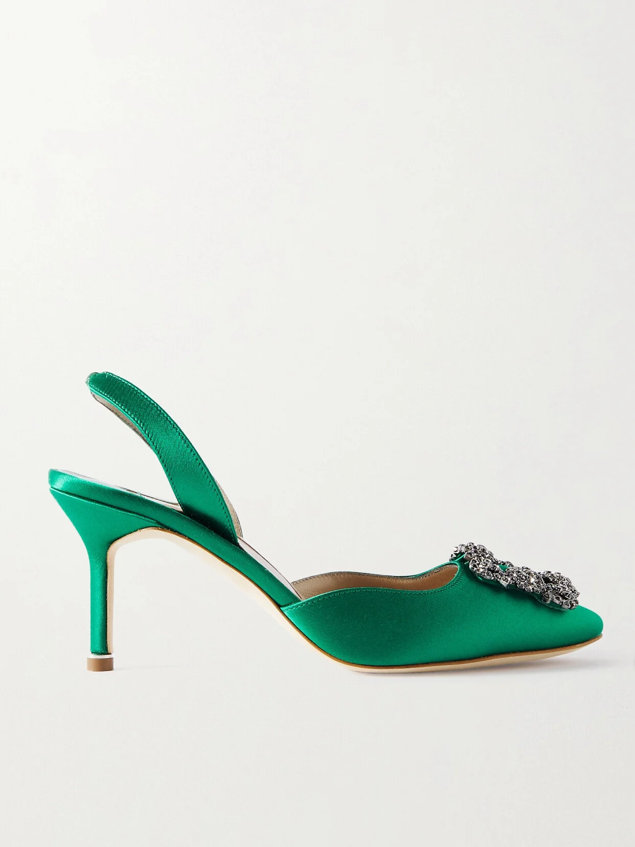 Manolo Blahnik has been the sole designer of his eponymous label since its conception in the '70s - he still sketches each by hand using watercolor ink, so they truly look like works of art. Made in Italy from emerald satin, these 'Hangisli' pumps have pointed toes topped with signature crystal-embellished buckles and partially elasticated slingback straps.