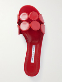 The geometric cutout straps on Manolo Blahnik's 'Haribalmu' slides are inspired by the works of artists Alexander Calder and Henri Matisse. They've been handmade in Italy from smooth leather and are set on 10mm heels. Size & Fit - Fits true to size, take your normal size - Italian sizing Details & Care - Heel measures approximately 10mm/ 0.5 inches - Red leather (Lamb) - Slip on