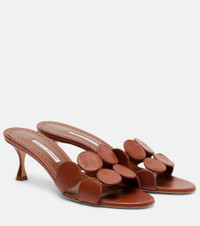 Slip into a unique pair of Manolo Blahnik's Haribalmu mules for an understated style statement. The design rests on 50mm heels and features connected circles of supple leather to form eye-catching uppers. Product Details - Upper: leather (nappa) - Lining: leather - Sole: leather insole and sole - Toe shape: almond open toe - Handmade in Italy - Includes: dust bag, shoe box - Designer color name: 2107 Mbrw - Item color: brown - Item number: P01073688 Size & Fit - True to size - European sizes - 5cm-2" heel (size EU 38)