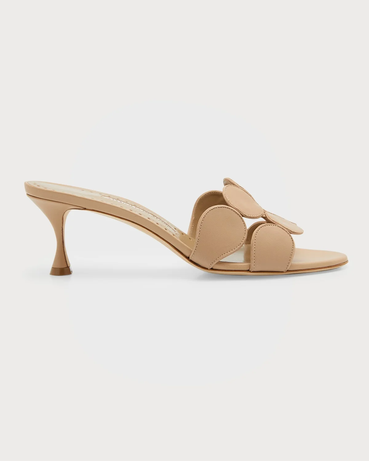 - Manolo Blahnik mule sandals in lambskin leather - 2.00 in / 50 mm kitten heel - Open toe - Lining: Leather - Leather outsole - Made in Italy - Size Note: Item runs small, consider ordering a size up.