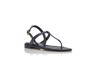 Navy blue calf leather flat sandals featuring open toe design with toe stem and an adjustable ankle strap with gold-finished buckle. Upper: 100% calf leather. Sole: 100% cow leather. Lining: 100% goat skin. Heel measures 10mm. Italian sizing. Made in Italy. Product ID: 221-0837-0005