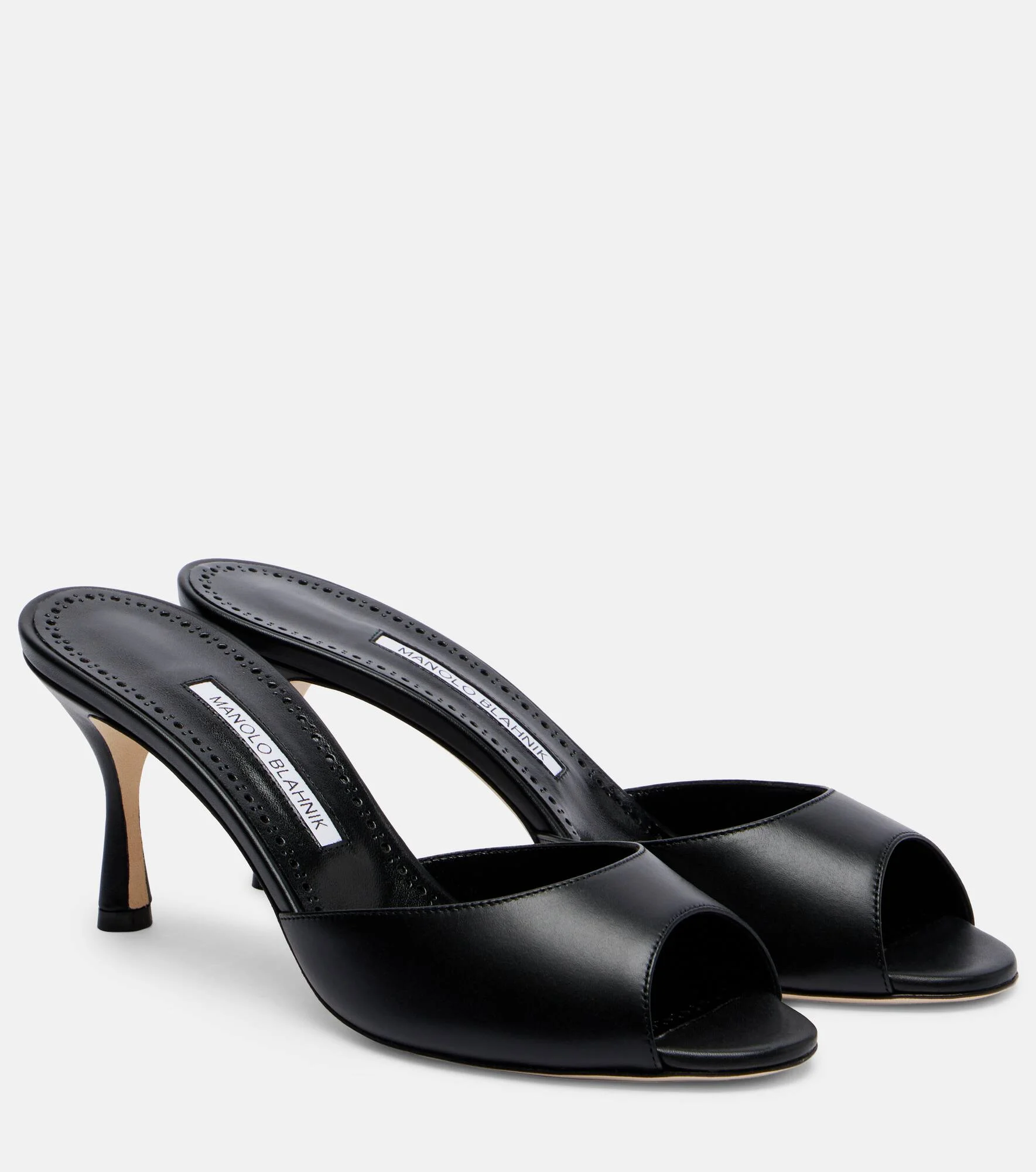 Every Manolo Blahnik shoe is sketched by the designer himself and is realized by skilled artisans in Italy. Set on slender 70mm stiletto heels, the Jada mules are crafted from calf leather with almond open toes. Product Details - Upper: calf leather - Lining: leather - Sole: leather insole and sole - Color: black - Toe shape: almond open toe - Handmade in Italy - Includes: dust bag - Designer color name: 0015 Blck - Item number: P01158670 Size & Fit - True to size - European sizes - 7cm-3" heel