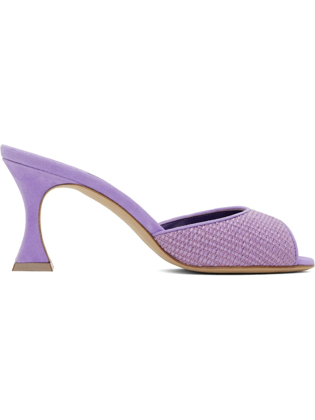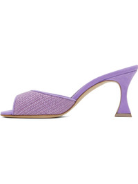 Woven raffia and suede heeled sandals in purple. · Open toe · Inset logo patch at padded footbed · Grained leather lining · Covered spool heel with rubber injection · Nubuck sole · Heel: H2.75" Supplier color: Medium purple Upper: textile, leather. Sole: leather, rubber. Made in Italy 251140F125004
