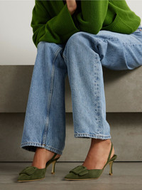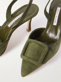 Manolo Blahnik's 'Maysli' pumps are a slingback interpretation of the label's 'Maysale' style, which first debuted in 1991. Made in Italy from green suede, they have slender 70mm heels and pointed toes topped with signature buckles. Wear yours with everything from formal dresses to tailoring. Size & Fit - Fits true to size, take your normal size - Italian sizing Details & Care - Heel measures approximately 70mm/ 3 inches - Green suede (Goat) - Elasticated slingback strap