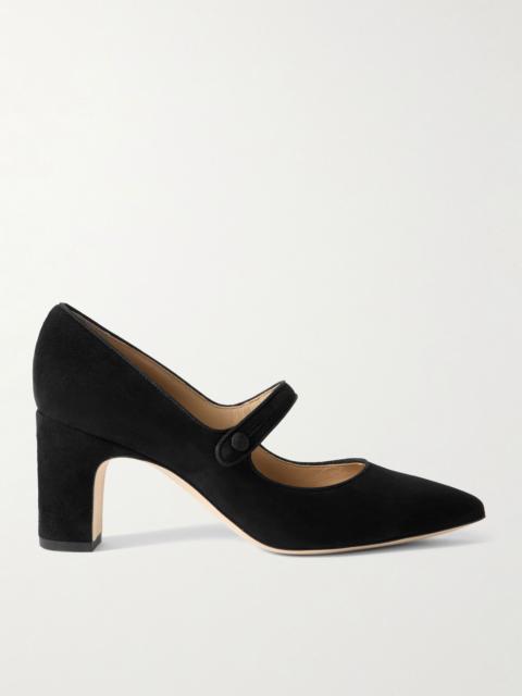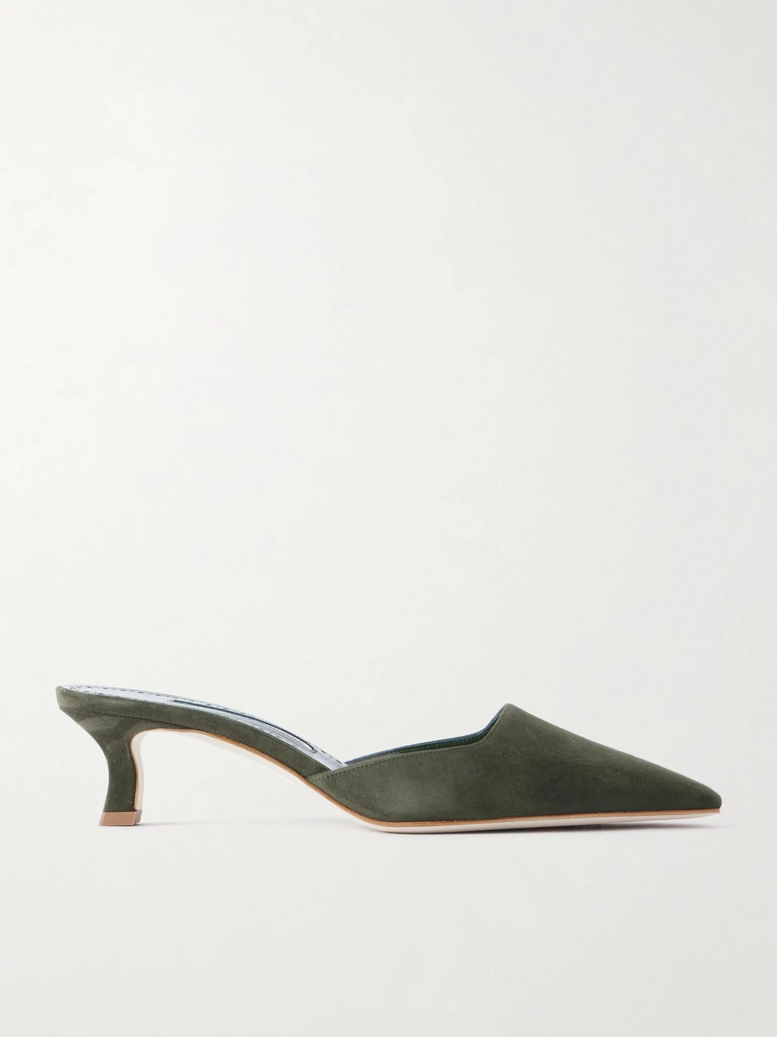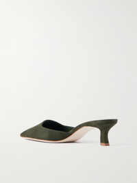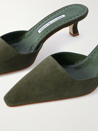 Manolo Blahnik’s ‘Moiramu’ mules are designed with low-cut, square vamps that have an elongating effect and modern look. They’ve been handcrafted in Italy from smooth suede and have flared kitten heels that offer 50mm of lift. Size & Fit - Fits true to size, take your normal size - Italian sizing Details & Care - Heel measures approximately 50mm/ 2 inches - Army-green suede (Goat) - Slip on