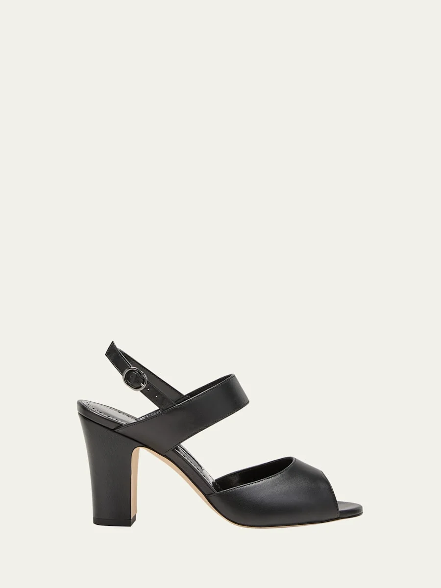 Manolo Blahnik "Khiko" smooth leather sandals 3.50 in / 90 mm thick stiletto heel Peep toe Adjustable slingback strap Leather outsole Lining: Goat leather Made in Italy Online Inquiries: BGS21_X7FUG| Store Inquiries: #4716852