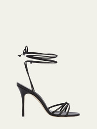 Manolo Blahnik "Leva" strappy napa lambskin leather sandals 4.25 in / 105 mm stiletto heel Open toe Crisscross vamp Adjustable ankle ties Leather outsole Lining: Leather Made in Italy