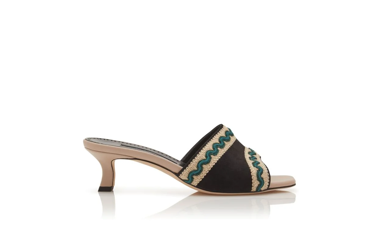 Light beige and black suede open toe mules featuring knitted ribbon detailing and an angular low heel. Upper:80% kid suede, 20% fabric.Sole:100% calf leather.Lining:100% kid leather.Heel measures:50 mm.Italian sizing. Made in Italy. Product ID: 425-2035-0001