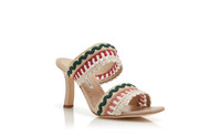 Light beige nappa leather open toe mules featuring two front straps with knitted ribbon detailing. Finished with an angular high heel. Upper:80% viscose, 20% acrylic.Sole:100% calf leather.Lining:100% kid leather.Heel measures:90 mm.Italian sizing. Made in Italy. Product ID: 425-2031-0004