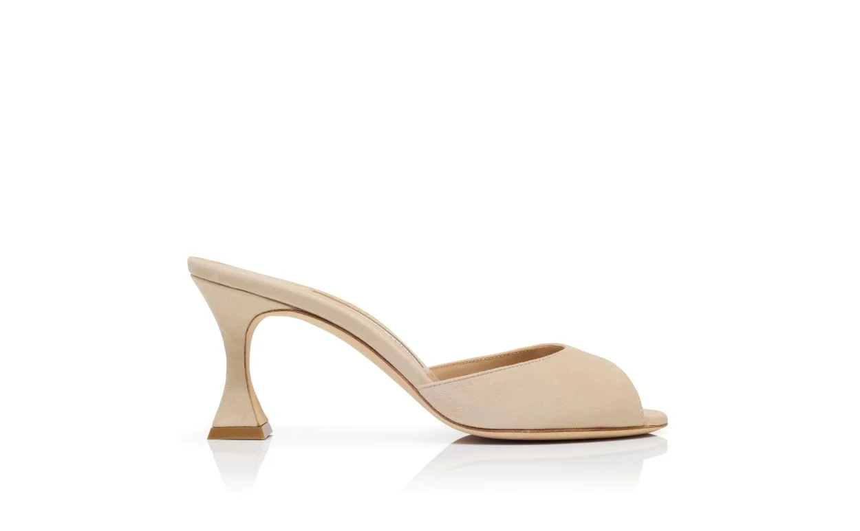 Light beige suede open toe mules featuring a flared mid heel. Upper:100% kid suede.Sole:100% calf leather.Lining:100% kid leather.Heel measures:70mm.Italian sizing. Made in Italy. Product ID: 425-2265-0002