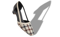 Light beige wool round toe pumps featuring cream calf leather straps, tartan toe cap and block low heel. Upper:90% wool, 10% calf leather.Sole:100% calf leather.Lining:100% kid leather.Heel measures:30 mm. Italian sizing. Made in Italy. Product ID: 325-3043-0001