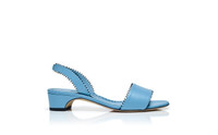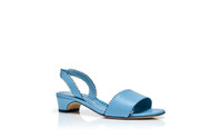 Light blue nappa leather open toe flat sandals featuring toe strap with pinking details, elasticated slingback design and low block heel. Upper: 100% lamb nappa. Sole: 100% calf leather. Lining: 100% kid leather. Heel measures 30 mm. Italian sizing. Made in Italy. Product ID: 225-1796-0004