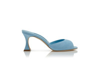 Light blue suede open toe mules featuring a flared mid heel. Upper:100% kid suede.Sole:100% calf leather.Lining:100% kid leather.Heel measures:70mm.Italian sizing. Made in Italy. Product ID: 425-2265-0001
