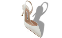 Light cream satin pointed toe slingback pumps featuring stiletto mid heel. Upper: 98% satin, 2% kid leather. Sole: 100% calf leather. Lining: 100% kid leather. Heel measures 70 mm. Italian sizing. Made in Italy. Product ID: 423-1805-0003