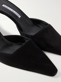 Manolo Blahnik’s ‘Moiramu’ mules are designed with low-cut, square vamps that have an elongating effect and modern look. They’ve been handcrafted in Italy from smooth suede and have flared kitten heels that offer 50mm of lift. Small to size. See Size & Fit notes. Size & Fit - Fits small to size, take a half size larger than normal - Italian sizing Details & Care - Heel measures approximately 50mm/ 2 inches - Black suede - Slip on