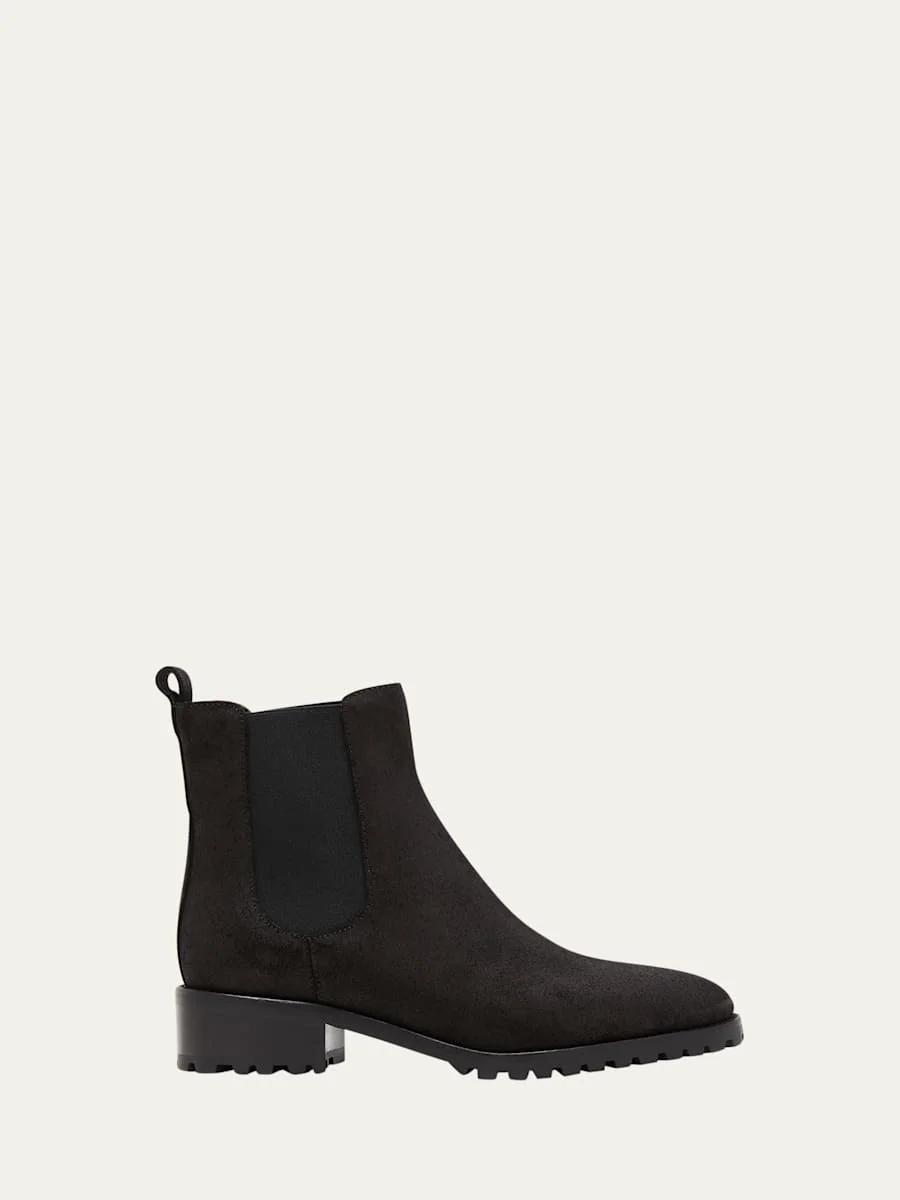 Manolo Blahnik "Chelata" suede casual Chelsea booties 1.25 in / 30 mm block heel Round toe Gored sides Pullon style Leather/Rubber outsole Lining: Leather Made in Italy