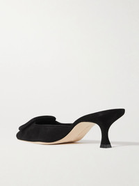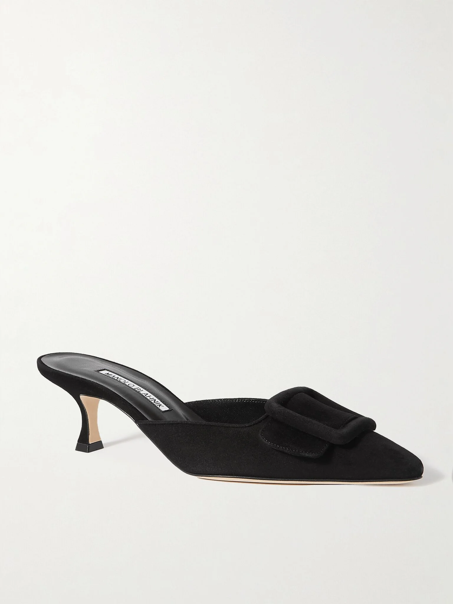 Manolo Blahnik debuted his iconic 'Maysale' mules in Isaac Mizrahi's Spring ’91 runway collection and they've been loved for the signature buckle topper ever since. This versatile black pair has been crafted by artisans in Italy from soft suede and set on a gently fluted 50mm kitten heel. They're lined and soled with smooth leather for extra comfort. Size & Fit - Fits true to size, take your normal size - Those with narrow feet may wish to take the next size down - Italian sizing Details & Care - Heel measures approximately 50mm/ 2 inches - Black suede (Goat) - Slip on - Made in Italy