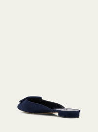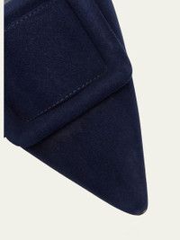 Manolo Blahnik "Maysale" suede ballerina mules with covered buckle detail. Flat heel. Pointed toe. Slide style. Leather lining and sole. Made in Italy.