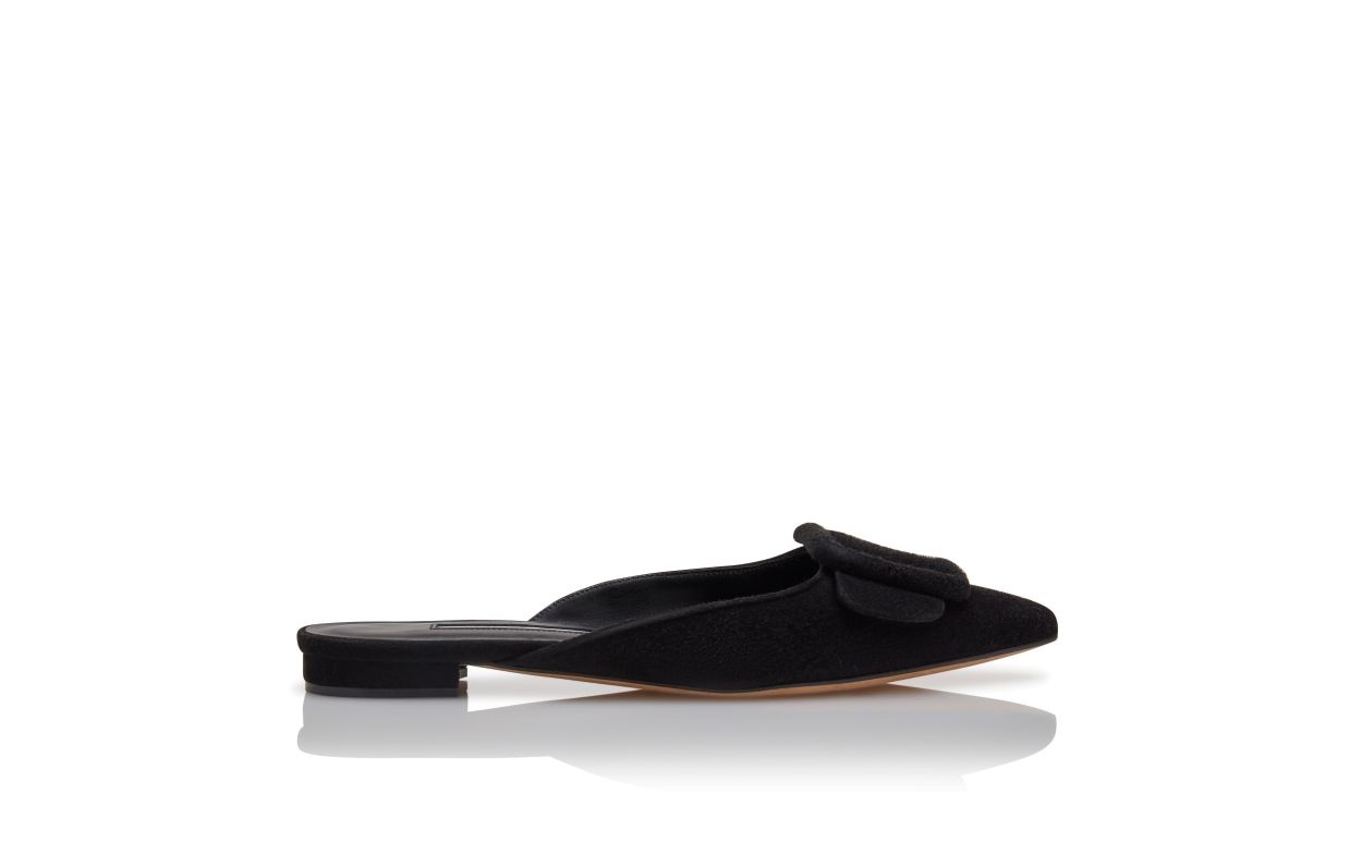 Black suede pointed toe flat mules featuring decorative buckle detail and flat stacked heel. Upper: 100% kid suede. Sole: 100% calf leather. Lining: 100% kid leather. Heel measures 10 mm. Italian sizing. Made in Italy. Product ID: 220-0546-0002
