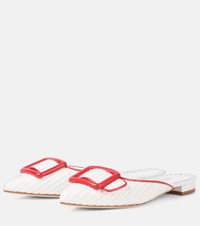A fresh take on Manolo Blahnik's classic Maysale mules, this pair is crafted from raffia with bold leather trimming. Featuring the brand's signature buckle details and flat stacked heels, they exude effortless summer elegance. Product Details - Upper: fabric - Lining: leather - Sole: leather insole and sole - Toe shape: pointed toe - Handmade in Italy - Includes: shoe box, dust bags - Designer color name: 1012 Whit/6208 Bred - Item color: white - Item number: P01043188 Size & Fit - Fits slightly large to size - we recommend trying a half size smaller - Wide - European sizes - 1,5cm-0.5" heel (size EU 38)