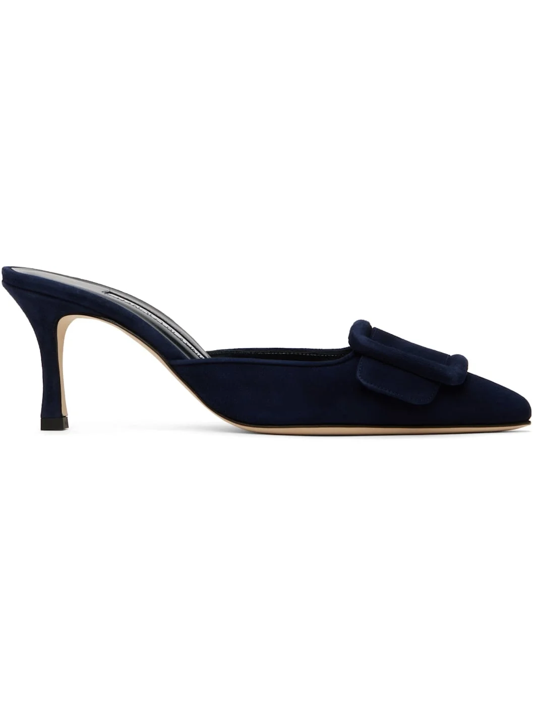 Handcrafted kidskin suede mules in navy. · Pointed toe · Buckle hardware at vamp · Inset logo patch at padded footbed · Grained kidskin lining · Covered heel with rubber injection · Calfskin nubuck sole · Heel: H2.5" Supplier color: Navy Upper: kidskin. Sole: calfskin, rubber. Made in Italy 251140F122020
