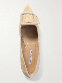 EDITORS'NOTES Manolo Blahnik's 'Maysale' style was created for Isaac Mizrahi's runway in 1991 and has been a brand icon ever since. These point-toe flats have been crafted in Italy from raffia and topped with a signature suede 'Pilgrim' buckle. SIZE & FIT - Fits true to size, take your normal size - Italian sizing DETAILS & CARE - Beige raffia, grey suede - Slip on