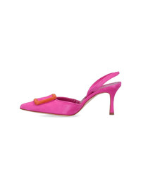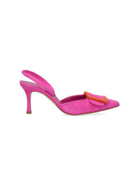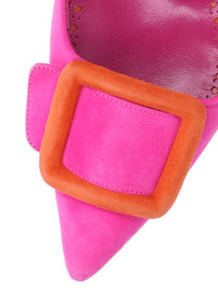 MANOLO BLAHNIK MAYSLI POINTED PUMPS IN PINK SUEDE WITH MAXI ORANGE BUCKLE DETAIL ON THE FRONT, ANKLE STRAP, STILETTO HEEL, LEATHER SOLE. PRODUCT INFO PRODUCT CODE 223 1531 0003BPNK 6704 DORA 8054 COMPOSITION: 100% LEATHER MADE IN: ITALIA - SOLE: 100% LEATHER - HEEL: 7 CM