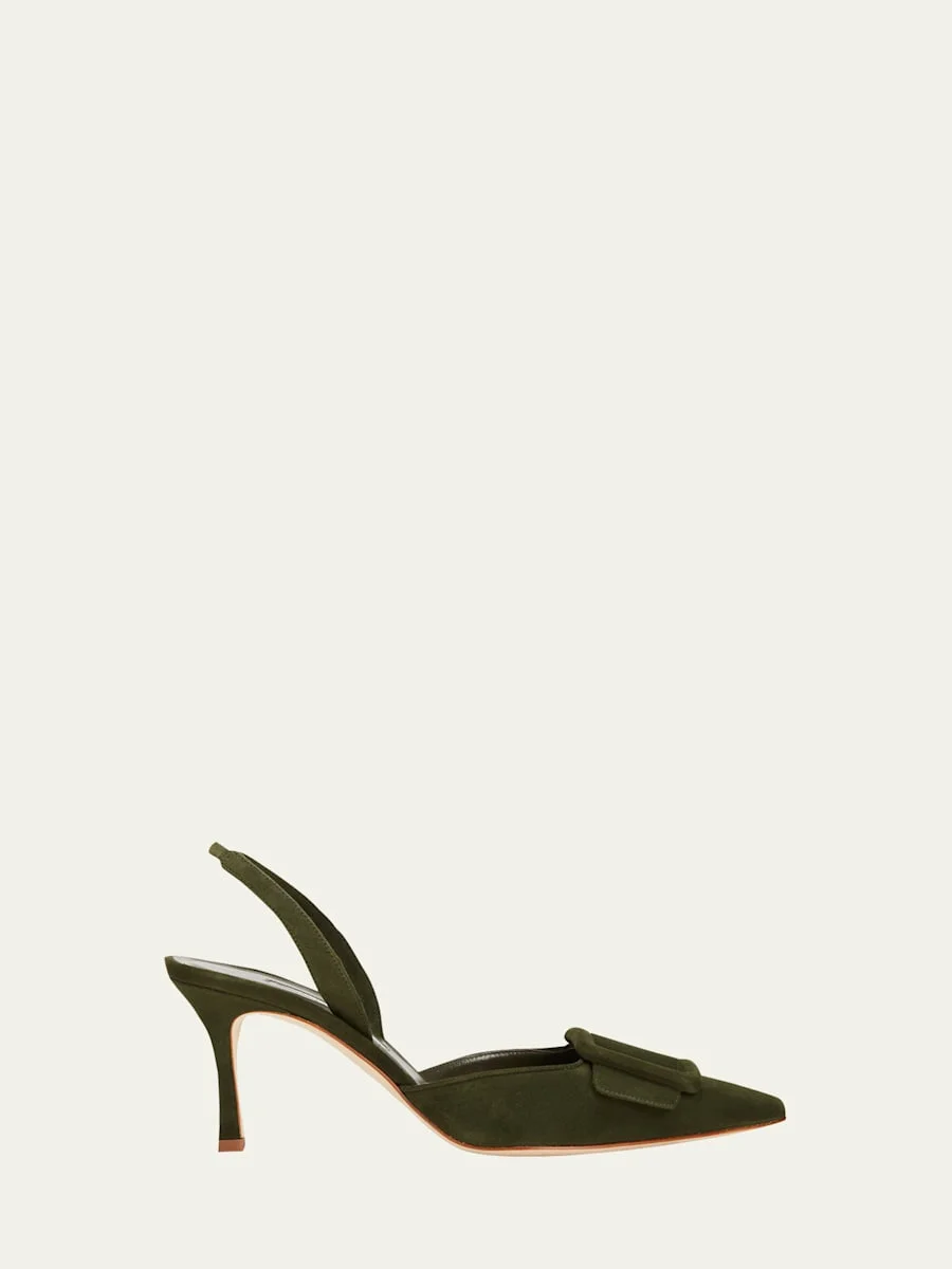 Manolo Blahnik "Maysli" calf suede pumps. 2.8" stiletto heel. Pointed toe. Bow accent at vamp. Stretch slingback strap. Leather lining and sole. Made in Italy. Online Inquiries: BGS21_X56TT| Store Inquiries: #3611216
