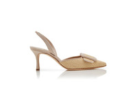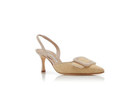Beige raffia pointed toe slingback pumps featuring decorative suede buckle, elasticated slingback strap and stiletto mid heel. Upper: 90% raffia, 10% lamb nappa. Sole: 100% calf leather. Lining: 100% kid leather. Heel measures 70 mm. Italian sizing. Made in Italy. Product ID: 424-1963-0004