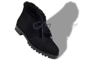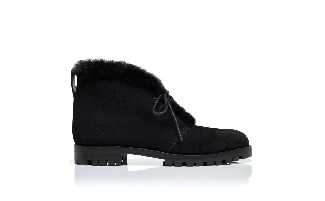 Black suede round toe ankle boots featuring shearling lining, lace-up closure and rear pull tab design. Finished with lugged rubber outsole. Upper: 100% kid suede. Sole: 100% rubber. Lining: 100% sheep leather. Heel measures 10 mm. Italian sizing. Made in Italy. Product ID: 320-1233-0004