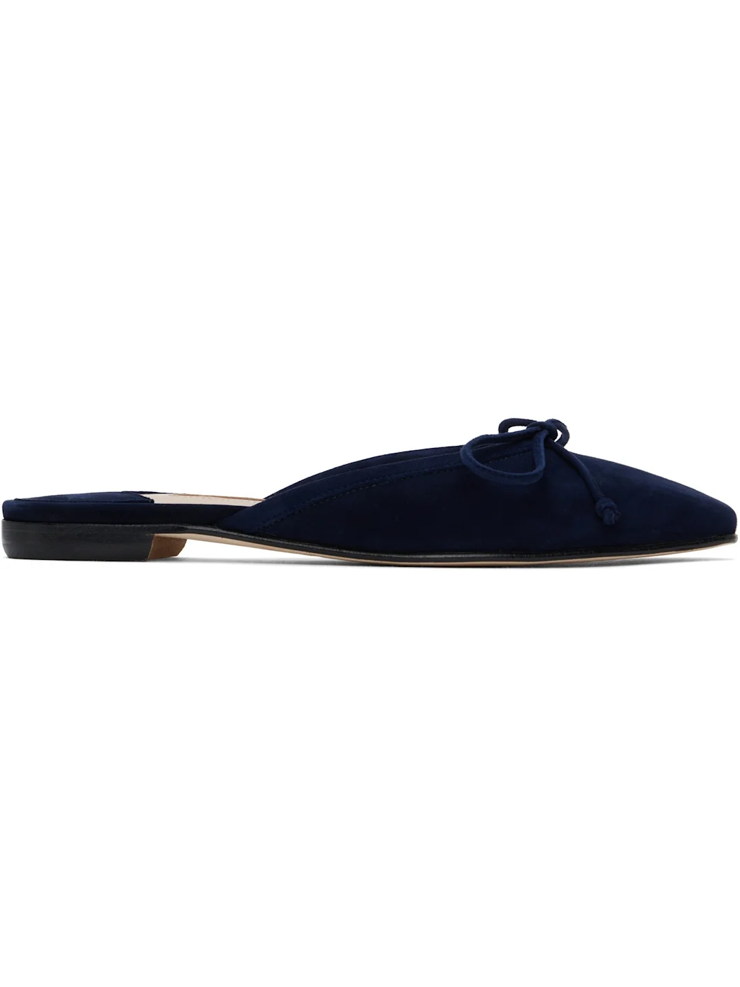 Handcrafted suede slip-on ballerina flats in navy. · Almond toe · Bow accent at vamp · Logo patch at padded footbed · Buffed goatskin lining · Stacked leather heel with rubber injection · Leather sole Supplier color: Navy Leather. Made in Italy 251140F121003