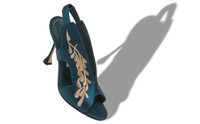 Navy blue satin open toe sandals featuring embroidered gold cascading leaf design and elasticated slingback design. Finished with flared high heel. Upper:72% viscose, 28% silk.Sole:100% calf leather.Lining:100% kid leather.Heel measures:105 mm.Italian sizing. Made in Italy. Product ID: 325-3005-0001