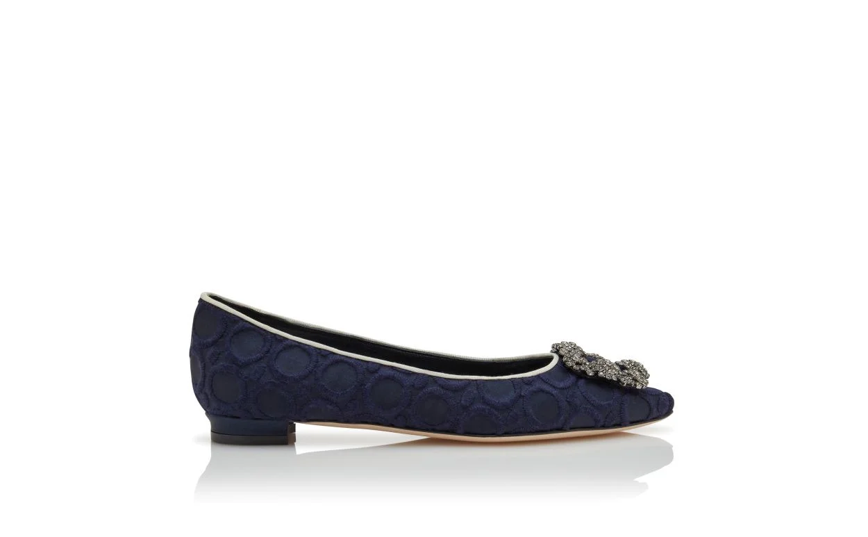 Navy Blue and White Silk Jewel Buckle Flat Pumps