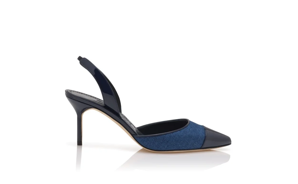 Navy blue linen pointed toe pumps featuring tonal patent leather toe cap, edging and elasticated slingback design. Finished with a stiletto mid heel. Upper:50% fabric, 50% patent calf.Sole:100% calf leather.Lining:100% kid leather.Heel measures:70 mm.Italian sizing. Made in Italy. Product ID: 126-3090-0004