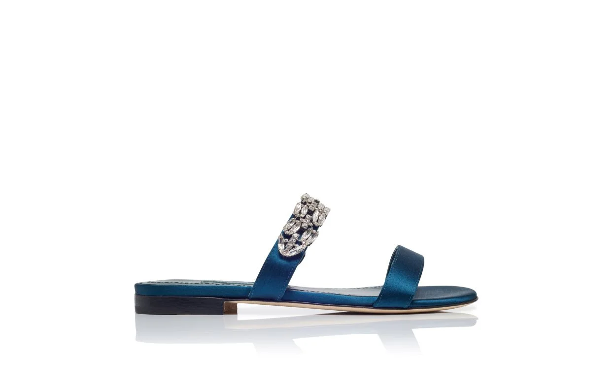 Navy Blue Satin Embellished Flat Sandals