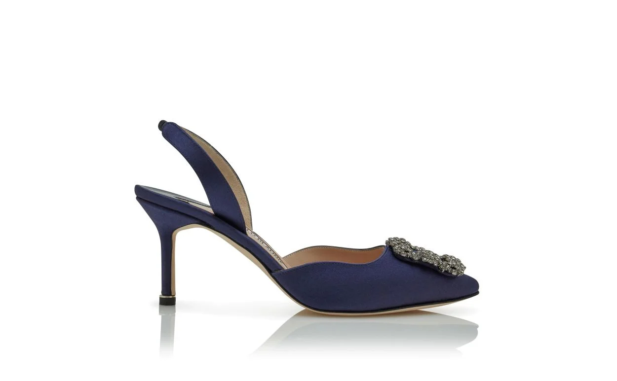 Navy Blue Satin Jewel Buckle Slingback Pumps