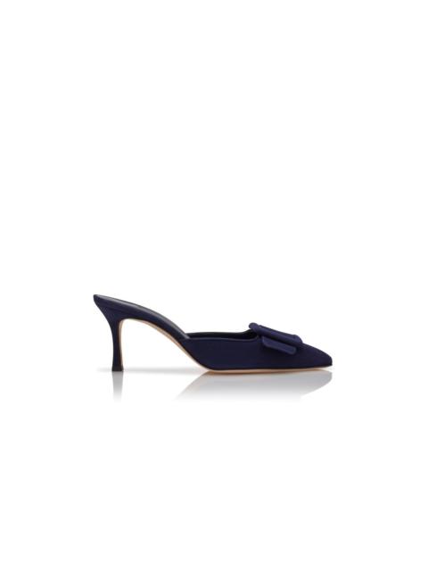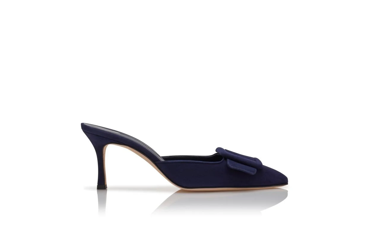 Navy blue suede almond toe mules featuring decorative buckle detail and stiletto mid heel. Upper: 100% kid suede. Sole: 100% calf leather. Lining: 100% kid leather. Heel measures 70 mm. Italian sizing. Made in Italy. Product ID: 9XX-0247-0009