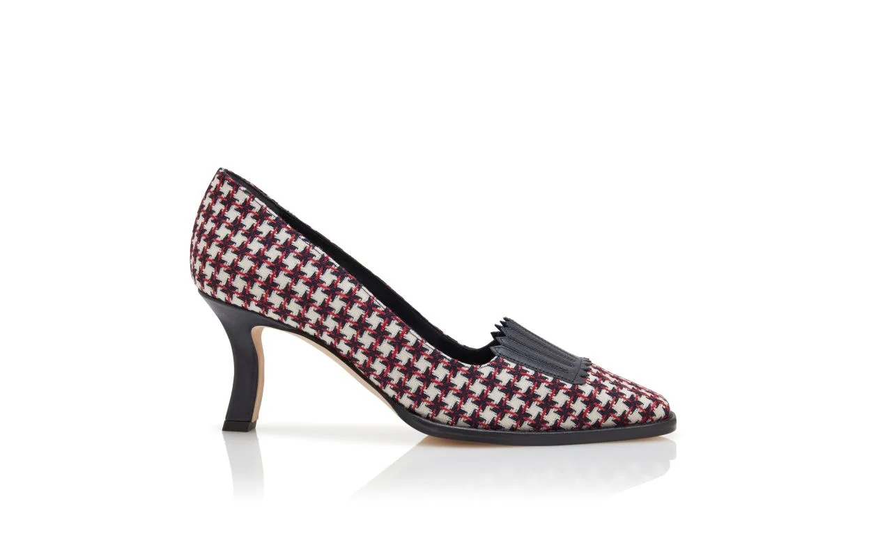 Navy blue wool pointed toe pumps featuring navy blue and red dogtooth design and nappa leather fringing details. Finished with flared mid heel. Upper: 90% wool, 10% lamb nappa. Sole: 100% calf leather. Lining: 100% kid leather. Heel measures 70 mm. Italian sizing. Made in Italy. Product ID: 225-1774-0001