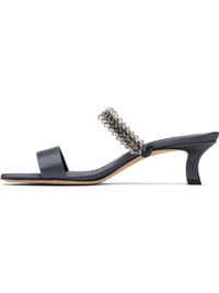 Satin mules. · Open toe · Elasticized strap with crystals at vamp · Logo patch at padded footbed · Buffed kidskin lining · Covered kitten heel with rubber injection · Calfskin lining · Heel: H1.75" Supplier color: Navy Upper: textile. Sole: calfskin, rubber. Made in Italy 252140F125003