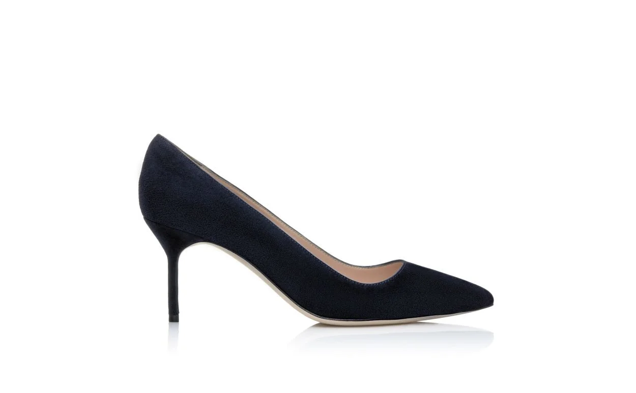 Navy suede pointed toe court shoes with a stiletto mid heel. Upper: 100% suede. Sole: 100% cow leather. Lining: 100% kid leather. Heel measures 70mm. Made in Italy. Product ID: 9XX-0415-0014