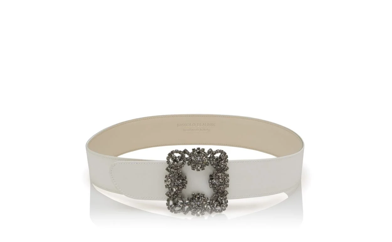 White satin belt featuring a moveable square crystal buckle with a push stud fastening. Upper: 68% viscose, 32% silk. Lining: 100% nappa leather. Made in Italy. Product ID: 118-0131-0004