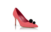Pink suede pointed toe pumps featuring black suede pom pom detail and stiletto high heel. Upper: 100 kid suede. Sole: 100% calf leather. Lining: 100% kid leather. Heel measures 90 mm. Italian sizing. Made in Italy. Product ID: 423-1637-0001