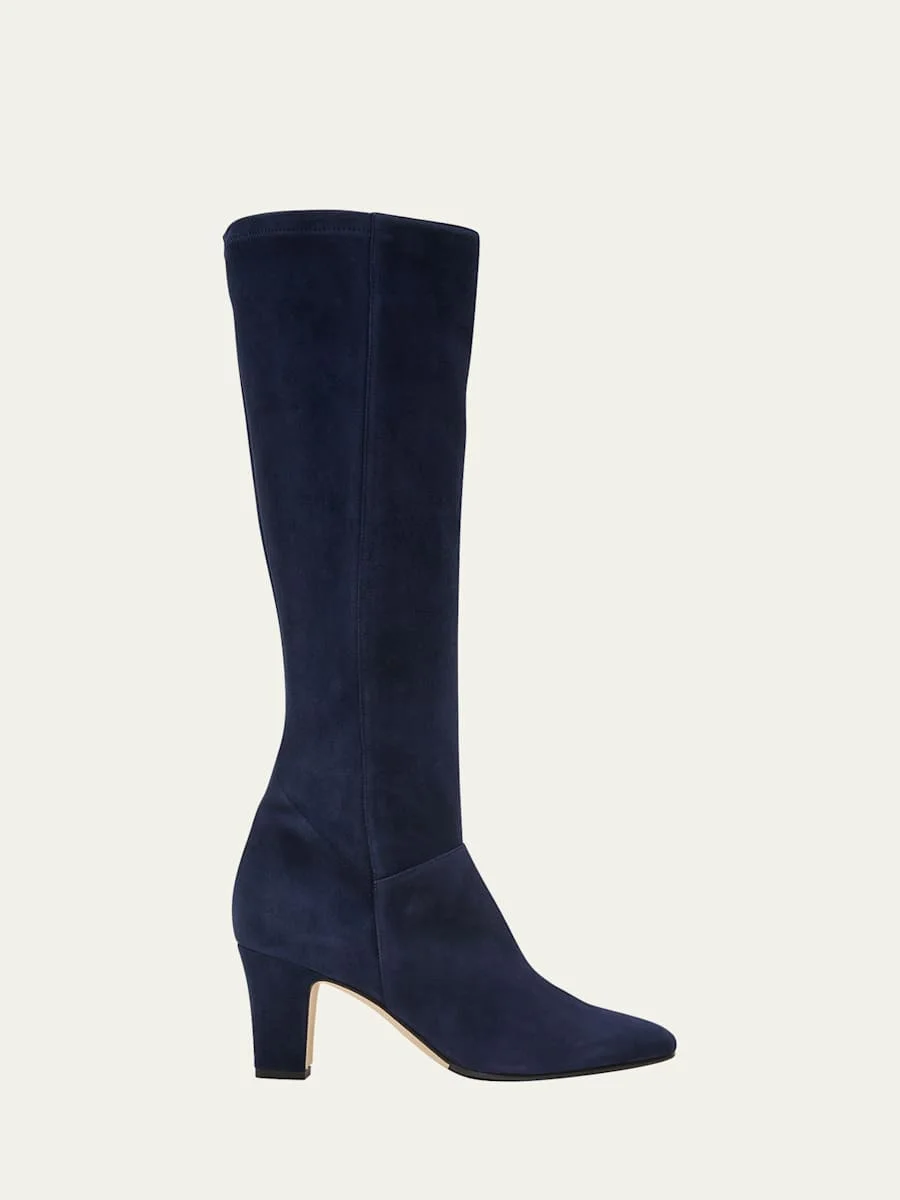 Manolo Blahnik "Pitana" classic suede knee boots 2.75 in / 70 mm block heel Almond toe Side zip eases dress Leather outsole Lining: Goat leather Made in Italy