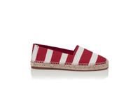 White cotton round toe espadrilles featuring red striped design and platform straw detailing with flat rubber sole. Upper: 100% cotton. Sole: 100% rubber. Lining: 100% kid leather. Heel measures 10 mm Italian sizing. Made in Italy. Product ID: 124-2719-0001