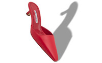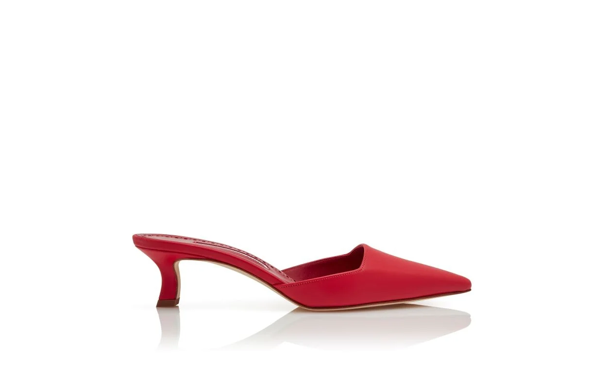 Red nappa leather pointed toe mules featuring square cut design and flared block low heel. Upper: 100% lamb nappa. Sole: 100% calf leather. Lining: 100% kid leather. Heel measures 50 mm. Italian sizing. Made in Italy. Product ID: 225-1809-0003