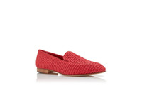 Red raffia round toe loafers featuring red nappa leather edging and flat stacked heel. Upper: 95% raffia, 5% lamb nappa. Sole: 100% calf leather. Lining: 100% kid leather. Heel measures 10 mm. Italian sizing. Made in Italy. Product ID: 224-1710-0002