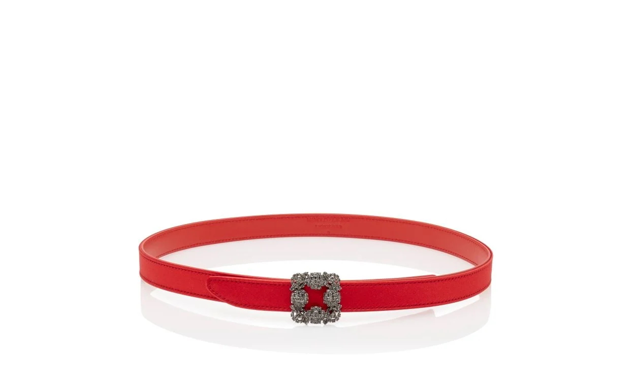 Red satin belt featuring narrow width design, moveable square crystal buckle and push stud fastening. Upper: 68% viscose, 32% silk. Lining: 100% nappa leather. Made in Italy. Product ID: 118-0147-0013