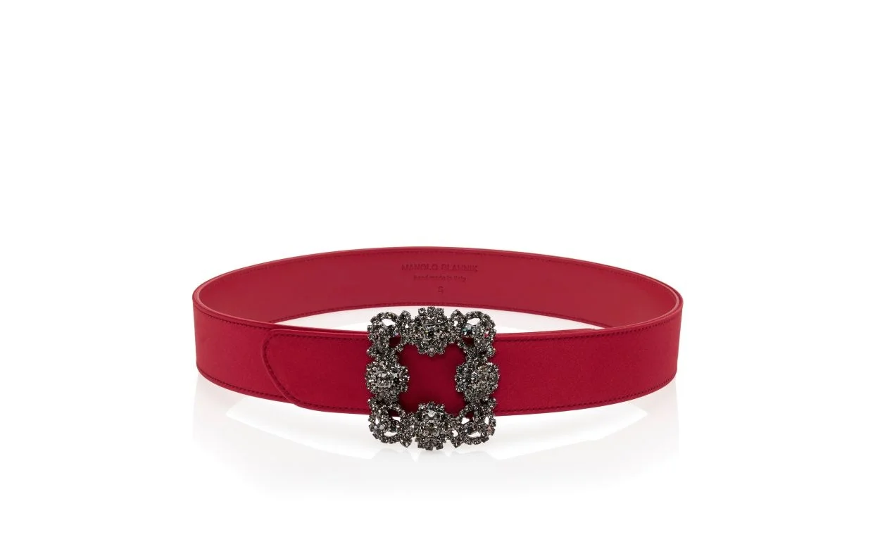 Red satin belt featuring a moveable square crystal buckle with a push stud fastening. Upper: 68% viscose, 32% silk. Lining: 100% nappa leather. Made in Italy. Product ID: 118-0131-0012
